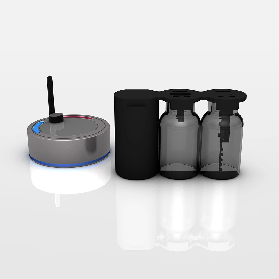 Small size real time temperature data logger with flexible temperature sensor, for placing between vials. Fits the height and diameter of 10R vials.